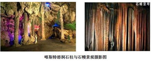 喀斯特溶洞是地下水沿可溶性岩体的层面、节理或裂隙进行溶蚀扩大而成的空洞,在喀斯特溶洞发展过程中,除了以溶蚀作用为主外,还伴有水利、机械等其他的侵蚀作用及生物作用。我国著名的喀斯特溶洞包括贵州的龙宫、桂林的芦笛岩等。溶洞中由于洞顶渗入的地下水中CO2含量较高,对可溶性石灰岩具有较强的溶蚀力,当这种溶液渗至洞内顶部出露形成水滴时,由于表面张力作用,水滴迅速释放出CO2形成碳酸钙薄膜沉积,随着不断渗流、沉积,洞顶形成具有空心的管状沉积物,直径一般小于1-2cm,成为石管。石管外壁也有渗滴水流时,石管就不断加大而成乳状沉积物,即石钟乳。当水滴从石钟乳上跌落至洞底时,变成许多小水珠或流动的水膜,这样就促进了水滴中CO2的散逸,而在洞底产生碳酸钙堆积,堆积物横切面没有中央通道,但具有同心圆结构,随水滴跌落不断由洞底往上增高形成锥状、塔状及盘状的沉积物,即石笋。由于重力作用,石钟乳和石笋相对增长,直至两者连接而成的柱状体,即石柱,随着洞顶下渗的水溶液继续沿石柱表面堆积,石柱不断加粗。含碳酸钙的水溶液在洞壁上漫流时,因CO2迅速逸散而产生片状和层状的碳酸钙堆积,即石幔,其表面具有弯曲的流纹,高度可达数十米,十分壮观。