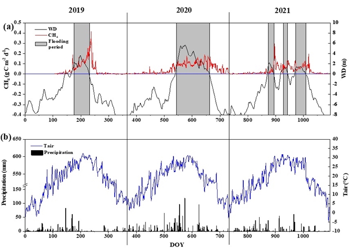 南荻生态系统甲烷通量、气温和降雨量的年际变化