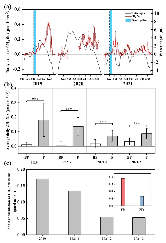 该研究在洞庭湖国家站谢永宏研究员和邓正苗研究员指导下,博士研究生王涛为第一作者,近期以Time-lag effects of flood stimulation on methane emissions in the Dongting Lake floodplain, China为题,发在农林科学领域一区Top期刊Agricultural And Forest Meteorology上。该研究得到国家自然科学基金联合基金、中国科学院青年创新促进会、湖南省自然科学杰出青年学者基金等项目的资助。