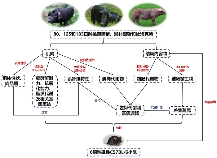 猪肉消费量占全球肉类消费量的三分之一,是我国重要的肉类来源。我国地方品种猪的资源丰富,并且多数品种以肉质优良而著称。因此,揭示其优质肉形成的分子机制,对通过营养调控策略改善商品猪的肉品质具有重要意义。近年来的研究表明,肠道微生物及其代谢产物在肉品质形成过程中发挥着重要作用,但其具体作用机制尚不明确。