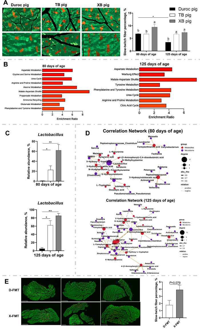 注:A. 三个品种猪慢肌纤维比例;B. 三个品种猪肌肉差异代谢物通路分析;C. 三个品种猪结肠乳杆菌丰度;D. 乳杆菌与色氨酸代谢物相关性网络图;E. 移植不同品种猪粪菌小鼠慢肌纤维比例。