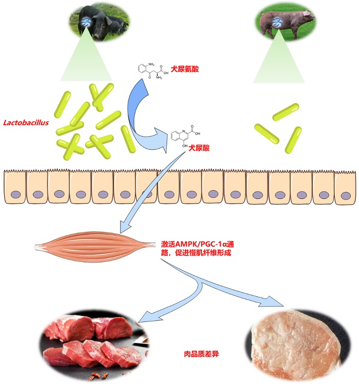 研究结果表明:1)桃源黑猪和湘村黑猪的慢肌纤维比例显著高于杜洛克猪,肌纤维横截面积更小,系水力和肌内脂肪含量更高,但胴体重较低。2)肌肉靶向代谢组检测发现了24种差异代谢物,其中β-丙氨酸和苹果酸含量与肌肉系水力呈显著正相关。3)地方品种猪肌肉中脂质分解相关基因(HSL、ATGL和CPT1)和糖酵解相关基因(LDH和PFKFB3)的表达较低,是其肌内脂肪含量较高而糖酵解潜力较低的原因。4)地方品种猪结肠中乳杆菌(Lactobacillus)的丰度较高,并可通过色氨酸代谢途径促进犬尿酸的合成;犬尿酸可激活肌肉AMPK/PGC-1α信号通路,上调肌肉中慢肌纤维的比例。5)FMT实验证实,移植地方品种猪肠道菌群的小鼠,机体犬尿酸水平和肌肉AMPK表达水平提高,其慢肌纤维比例呈上升趋势。