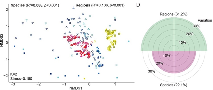 图2 不同胃肠道区域和反刍动物物种的病毒多样性及解释贡献度占比