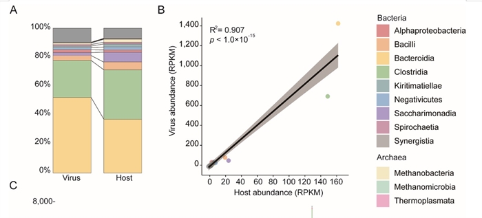 图3 病毒及其宿主丰度呈现强烈线性相关关系
