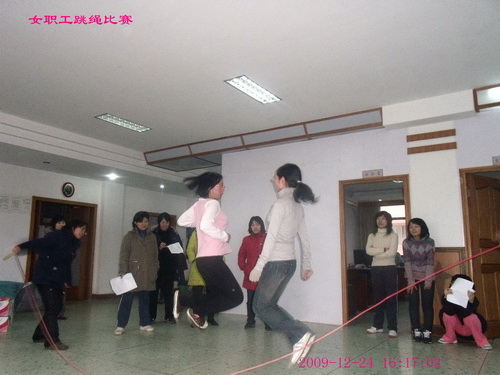比赛开始了,大家脱掉厚厚的冬衣,铆足了劲,一次次向自己的体能和运动极限发起冲刺。财务部的易郁兰同志以三次连续跳超过2000次的绝对优势取得了个人比赛的第一名。