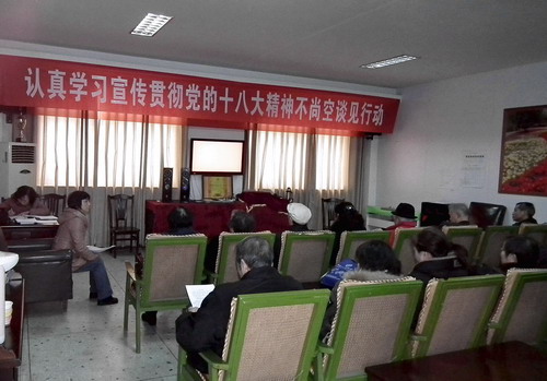 12月3日,根据院、省《关于认真学习宣传贯彻党的十八大精神通知》要求,以及所党委学习宣传与贯彻落实党的十八大精神工作方案,离退休党支部在离退办活动室召开了全体党员会议,开展学习讨论座谈。