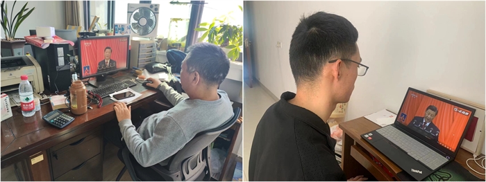 虽然是休息日,但许多党员同志依然奋斗在科研工作的一线,在做好科研工作的同时,牢记党员身份,积极收看开幕会直播。与此同时,相关课题组的入党积极分子和民主党派人士也在各自的岗位上纷纷加入,共同学习。