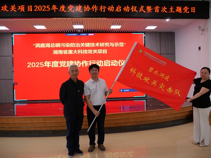 党委委员、副所长谢永宏宣读“碧水洞庭科技攻关突击队”成立文件,党委书记谭支良为第二党支部书记、突击队队长邓正苗颁发聘书,并为突击队授旗。邓正苗在表态发言中表示,全体突击队员将不负所党委的信任和期望,以党建为引领,以党组织联建、队伍联育、资源联享为抓手,破解洞庭湖总磷治理瓶颈,在具体行动上强化政治担当,锻造攻坚铁军,锚定技术突破,创新治理路径,践行系统治理,守护生态底色,发挥大兵团科技队伍优势,为项目重大成果产出贡献突击队力量。