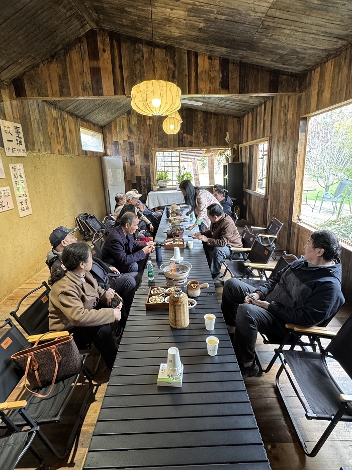 炭火微红,茶香袅袅,老同志们围坐一堂,在春意盎然的美景中品茗畅谈,回忆峥嵘岁月,分享退休后的生活趣事,畅谈对幸福晚年的感悟,现场欢声笑语,气氛温馨融洽。