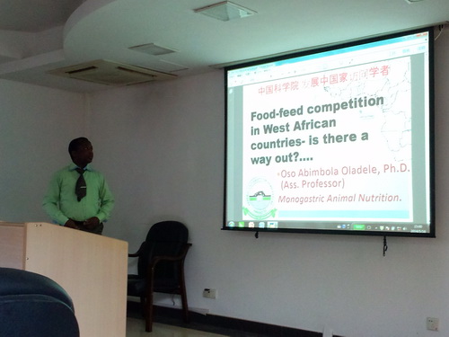 5月16日下午,中国科学院发展中国家访问学者计划,尼日利亚联邦农业大学畜牧科技学院访问学者Oso Abimbola Oladele副教授(博士)在中国科学院亚热带农业生态研究所作了题为“Food-feed competition in West African countries- is there a way out?”(在西非国家食品饲料竞争有出路?)的学术报告,Oso Abimbola Oladele从西非国家人畜争粮的现状及发展,提出了研发新型饲料原料的必要性与解决的办法。