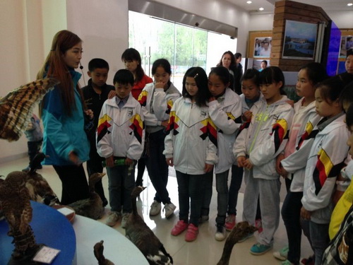 此次活动共安排了四大内容。一是生物多样性保护教育活动。首先由洞庭湖站李峰副研究员做了题为“长江中下游湿地生物多样性及保护”的报告,详细介绍了长江中下游地区湿地生物多样性的现状、多样性丧失的原因及保护对策。随后在站相关人员的带领下,参观了湿地标本馆,重点了解了洞庭湖湿地生物多样性的现状,增强了青少年对生物多样性的保护意识;二是在站科研人员的带领下参观了洞庭湖站综合试验场,详细听取了站科研人员有关科学实验设计、循环湿地农业、湿地恢复及湿地资源利用等知识的讲解,使青少年认识湿地的重要功能和科学家在湿地保护中所做的努力;三是组织学生观看了越冬候鸟小白额雁迁徙的4D电影,使青少年学生认识候鸟的迁飞历程,培养青少年爱鸟、护鸟的意识;四是讲解了麋鹿的历史和保护现状,并介绍了麋鹿在洞庭湖的分布情况,通过喂食麋鹿,使学生了解了生境多样性保护的意义,增强了青少年学生在野生动物保护中的参与意识。