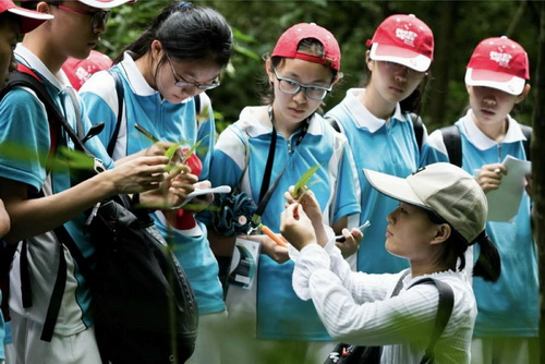 一群中学生全神贯注的看着老师手中的植物叶片,聆听着老师的讲解,这是发生在2017年7月北京十中和上海金山中学科技英才张家界科学探索活动上的一幕。