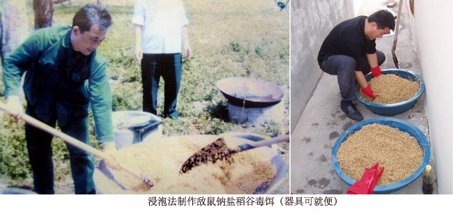 浸泡法:能溶于水的灭鼠剂可采用此法。例如:配制0.05%敌鼠钠盐稻谷毒饵10千克时,将稻谷先扇除秕子,称取10千克净谷放在容器内;再将敌鼠钠盐原药5克溶解于100毫升95%酒精中,然后兑入2千克清水中搅匀【若无酒精,可直接用2千克100℃开水溶解。该药溶解度仅5%,需采用“少量多次溶解法”,即将碾细的药粉一点一点散投进沸水中,边搅溶边加,直至完全溶解成淡黄色透明药液】。接着就将此药液洌入盛稻谷的容器中,反复多次搅拌至谷物将药液吸尽,就可趁鲜使用。而为防止误用误食,毒饵制成时,务必取出约十分之一以蓝黑墨水或红墨水染色,风干至着色牢固之后,再重新并入全部毒饵中拌匀,使每握毒饵都有染色谷粒,用以对人的警戒。