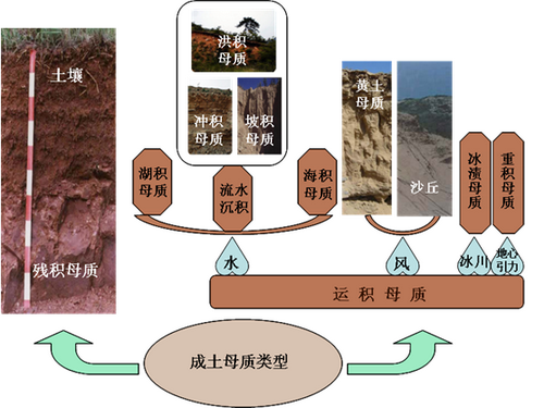 我的兄弟姐妹很多,各兄弟姐妹都有差异,按形成因素划分,可分为残积母质和运积母质两大类。残积母质是指岩石风化后,基本上未经动力搬运而残留在原地的风化物;运积母质是指母质经外力作用而迁移到其它地区的物质,比如通过流水将母质冲运到其它地方再沉积下来,就形成了流水沉积母质;另外通过风、冰川和地心引力等作用将岩石风化物搬运到其它地方沉积下来就形成了其它相应的母质。按不同外力作用又可分为不同的类型,如下图。