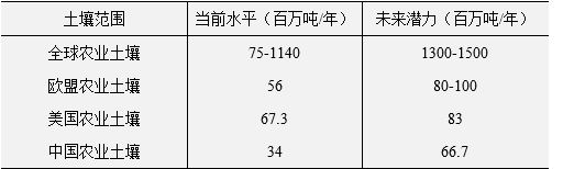 土壤每年向大气释放的CO2为50-76GtC(GtC ——CO2中碳成分的重量为109吨),远远超过化石燃料燃烧每年向大气排放的5 GtC。全球农业减排的技术潜力高达每年5500-6000 Mt(兆吨)CO2当量,其中90%来自减少土壤CO2释放(即土壤固碳),农业土壤固碳减排成为全球气候变化研究热点之一。因此,利用土壤抑制温室气体含量具有重大的意义,减少土壤中碳的释放,让大气中碳回到土壤中,无疑会对是拯救全球变暖的一个思路。不同国家和地区土壤自然固碳潜力如下: