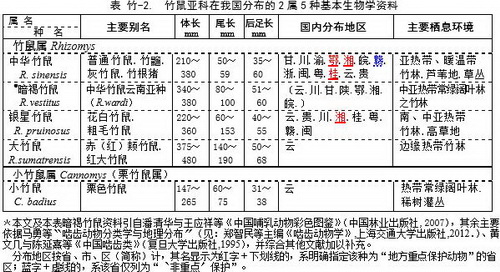 具国际影响力的Wilson and Reeder《世界哺乳动物物种》(2005)新分类系统中,我国分布的鼹形鼠科竹鼠亚科为2属4种,我国汪松等《中国物种红色名录》(2004)、郑智民(马勇)等《啮齿动物学》(2012)皆采此说,潘清华与王应祥等(2007)则将原中华竹鼠云南亚种订正为暗褐竹鼠Rhizomys vestitus,列为独立物种。为便于读者了解,今将该5种竹鼠的基本生物学资料一并列于表 竹-2。