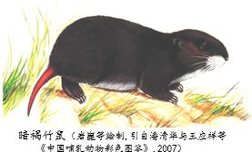 暗褐竹鼠Rhizomys vestitus Milne-Edwards,1871 英文名Milne-Edwards’ Bamboo Rat。体形与中华竹鼠相同,但较大,体重1.3~1.9千克,体长34~39厘米。被毛厚密,柔软似绒,体色是亚洲竹鼠类群中最深暗的,上体暗烟褐色或褐灰色,毛基烟灰色,面颊较体背和体侧色更深,多黑褐色;下体较淡,毛稀而短,吻周及颏部白灰色,胸、腹浅褐色,多灰色色调。尾短,仅达体长的1/4,具稀毛而不裸露。头骨粗壮,颅长75.6~83.1毫米,矢状嵴和人字嵴高而锋利为竹鼠属中最发达者,眶前孔较圆,颧弓粗壮并剧烈向外扩张,两侧缘前窄后宽不平行;枕部高而倾斜;上臼齿齿冠甚高。栖于海拔2000~2600米的中亚热带常绿阔叶林的竹林中,洞口多在竹丛根部附近,隐于草丛间。夜行性,晨昏活动频繁。以竹根、竹节和竹笋等为食。为林区竹林常见种。