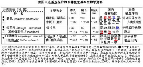 本篇讲述未列在《国“三有”动物名录》上、系各省自行选定为“地方重点保护”的3种鼠,其基本生物学资料汇总于下表: