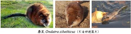 麝鼠Ondatra zibethicus(Linnaeus,1776):别名麝香鼠、青眼貂、水耗子,英文名Common Muskrat Musquash,系仓鼠科田鼠亚科麝鼠属,该属仅此1种。是田鼠亚科里体型最大者,营水陆两栖生活;以尾侧扁和后足具半蹼2项特征,区别于国内田鼠亚科其他种类。