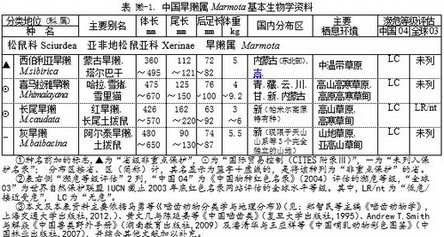 旱獭属全世界共14种,分布欧亚大陆和北美洲。中国有4种,其基本生物学资料列于表 獭-1。
