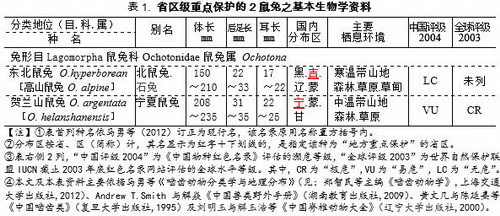《地方重点保护野生动物名录》在兔形目方面,吉林(1985)加列了“高山鼠兔Ochotona alpine”,宁夏(1990)加列了“贺兰山鼠兔Ochotona helanshanensis”。人们现实生活中通常将鼠兔视作“鼠类”,而且这2种鼠兔也很有特色,我们在本专题之末也就连帯作个介绍,其基本生物学资料汇总于表1。为同国际接轨,这2种动物皆改用现行名称,该名录原用名乃置于方括号内。