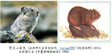 表1给出了世纪初对这2种动物的濒危等级评估。贺兰山鼠兔处于“易危”~“极危”,它是中国特有种,分布区又极窄小,为保护生物多样性,对它实施重点保护显然十分必要。