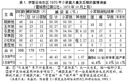 小家鼠上世纪在北疆5次大暴发之外,还有多次小暴发。表1所示“捕获率”是鼠的相对数量指标,系采取“夹日法”调查所得。即用铁板夹,以生倭瓜籽为饵,每个调查地块约100个夹,循一直线走5米摆置1夹(住宅区则是每1间房置1夹),放置1昼夜(下午置、翌晨收),按实收夹数计算百夹捕获鼠数,称“夹日捕获率(﹪)”,可反映鼠在该片的相对密度。由于是一线向前隨机放置,不得特意寻找鼠洞、鼠迹专注捕捉,而正常情况下鼠会各自保持一片“领地”互相分隔开,所以平常年份每百夹只会捕到一二十只鼠。1970年10月上旬霍城5类主要生境小家鼠平均捕获率达50.70﹪,这是“大暴发”状况,其实此时当地已过暴发顶峰并进行了大规模群众性灭鼠。1967年天山北麓农区无夹日调查数据,按群众描述作比对,估计其顶峰时平均捕获率应达60﹪以上。