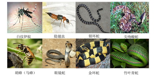 第一类(蚊子):一种具有刺吸式口器的纤小飞虫,通常雌性以血液为食物,雄性则吸食植物的汁液。亚热带地区主要的蚊种有:中华按蚊、嗜人按蚊、微小按蚊、大劣按蚊、致倦库蚊、三带喙库蚊、白纹伊蚊,其中白纹伊蚊(俗称美国蚊子)(见下图)最毒。对人类的危害主要是通过6枚针状结构刺进人的皮肤,同时释放含有抗凝血剂来防止血液凝结。此外,吸血的雌蚊是登革热、疟疾、黄热病、丝虫病、日本脑炎等其他病原体的中间寄主。第二类(蜂类):中国蜇人害蜂分为3个类型:胡蜂(马蜂)、蜜蜂、熊蜂。其中给人造成危害的主要是第一类(见下图),广泛分布在亚热带地区的野外。健康人1次遭10只蜂蛰只引起局部反应,如受200~300只蜂蛰,可出现心血管紊乱,如同时受500~1000只蜂蛰伤,可能因呼吸中枢麻痹及过敏致死,此时的蜂毒可作致死量。第三类(隐翅虫):毒隐翅虫身长0.6~0.8cm,类似飞蚂蚁(见下图),夏秋两季常见,白天栖息在杂草石下,夜间出来活动,具有趋光性,体外没有毒腺,不会蜇人,体内毒液一般不释出,只有当虫体被压迫或击碎时,皮肤接触毒液才引起病,其性质尚未确定,是一种非蛋白质,似斑蝥毒物,过去一直认为是“强酸物质”,现经研究其pH为4.3~4.9、6~7、7~8,为弱酸物质。患处初呈红斑,稍水肿,随后发生密集小丘疹,继之可出现水疱,脓疱,甚至伴随淋巴结肿大,发烧。愈后留有一过性色素沉着,皮损类型可为形状、点状、斑状,以形状多见。第四类(蛇类):多数情况下,蛇遇上敌害时首先是逃避,来不及逃走时就会利用枯枝、烂草、石头等掩护,就地躲藏起来。如果这招不成功,就做出威吓和警告的姿势,只有在这一切都失败后,才会被迫自卫还击。因此,毒蛇咬人一般发生在夜晚和清晨,气温较低,对各种刺激感觉迟钝,当发现人时,自感处境危险,就会咬人。外观上毒蛇一般头大颈细,头呈三角形,尾巴短而粗由肛门后突然变细,体背颜色较鲜明,多在夜间活动,发现人后一般不逃跑或者逃跑速度不快;无毒蛇头呈钝圆形,颈不细,尾部细长,体背颜色不鲜明,发现人后马上窜逃。但是外观判断只针对大部分蛇,其主要的辨别为:毒蛇有毒腺,有毒牙既长又大,毒蛇的牙痕为单排,无毒蛇牙痕为双排;我国常见的毒蛇有眼镜蛇、银环蛇、金环蛇、尖吻蝮(五步蛇)、竹叶青蛇等(见下图)。