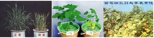 氮是植物体最重要的营养元素之一,是植物体内氨基酸、蛋白质及进行光合作用的叶绿素的重要组成部分,可以促进植物的叶面生长,使植物叶色更绿、枝叶茂盛,在很大程度上决定了作物的产量的质量。氮不足时,农作物会表现为植株矮小,细弱;叶呈黄绿、黄橙等非正常绿色,基部叶片逐渐干燥枯萎;根系分枝少;禾谷类作物的分蘖显著减少,甚至不分蘖,幼穗分化差,分枝少,穗形小,作物早衰并早熟,产量降低。然而,氮过量同样会对农作物产生消极的影响。氮营养过量的一般表现是:生长过于繁茂,腋芽不断出生,分蘖往往过多,妨碍生殖器官的正常发育,以至推迟成熟,叶呈浓绿色,茎叶柔嫩多汁,体内可溶性非蛋白态氮含量过高,易遭病虫为害,容易倒伏。禾谷类作物的谷粒不饱满(千粒重低),秕粒多;棉花烂铃增加,铃壳厚,棉纤维品质降低;甘蔗含糖率降低;薯类薯块变小,豆科作物枝叶繁茂,结荚少,作物产量降低。