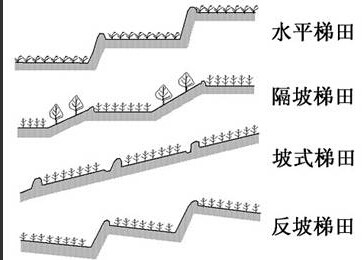 梯田是人们对自然地形的改变。按田面坡度不同而有水平梯田、坡式梯田、复式梯田等。水平梯田是最常见的一种梯田,其耕作地块是水平的,保水、保土、增产效果较好。坡式梯田坡面上地埂呈阶梯状,而地块呈斜坡。坡式梯田是为了减少水土流失量,在适当位置垒石筑埂,并逐步加高,地块内坡度逐步减小,从而增加地表径流的下渗量,减少地面冲刷,有条件时即可改造为水平梯田。反坡梯田是坡式梯田的一种特殊形式,坡面外高内低,能改善立地条件,蓄水保土,适用于干旱及水土冲刷较重而坡行平整的山坡地及黄土高原,但修筑较费工。复式梯田指因山就势、因地制宜在山丘坡面上开辟的水平梯田、坡式梯田、隔坡梯田等多种形式的梯田组合,还可配合水平沟等水土保持工程,以提高坡面耕地的保水抗蚀能力,复式梯田可更合理地利用土地,节省工程投资和提高水土保持效益。另外还有一种水平梯田和自然坡地相结合的隔坡梯田,即上一阶梯田与下一阶梯田之间保留一定的原始坡地。水平梯田上种作物,坡地上种草、集水。水平梯田与坡地两带宽度比一般为1:1。