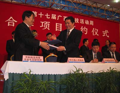 亚热带农业生态研究所与地处西南喀斯特区域的国家贫困县环江县的合作始于1994年,研究所积极参与环江县的喀斯特环境移民、科技扶贫和生态环境建设研究示范工作,在广西乃至在全国产生了的巨大社会影响。针对西南喀斯区生态环境退化与石漠化严重问题,亚热带农业生态研究所建设喀斯特生态站列入该所创新试点工程,得到了中科院党组的批准,也得到县政府积极支持。建站4年来,环江县政府已投入704万元用于环江站的征地、基地建设、道路等基础设施建设,为环江站研究能力建设奠定了基础,创立了在西部贫困地区院地合作,共建生态环境研究示范平台与区域科技创新体系的新机制。现已完成试验站综合楼、气象站及实验室、坡地定位观测径流小区、旱地及水田土壤养分定位观测场以及道路、水电、通讯等工程,并争取到中国科学院西部行动计划重大项目、国家973计划喀斯特课题、国家重大科技支撑计划课题与广西重大创新项目等一系列喀斯特生态研究项目。通过科技部评审,环江站成为国家野外科学观测研究站网络中目前全国唯一的喀斯特站,为环江县通过全国生态示范县验收和争取国家“十一五”喀斯特石漠化治理示范县、国家水土保持科技示范园区提供了示范样板和技术支撑。(环江站供稿)