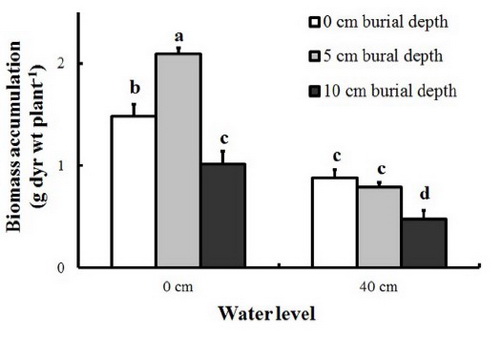 植物可通过生态生理特征的调整来适应外界环境胁迫。当两种或几种胁迫共存时,受体内能量的限制,植物的调整具有选择性,即植物应当优先对胁迫较大的因子做出响应。湿地生态系统中,洪水和泥沙淤积是较为常见的两种环境胁迫,当两种胁迫共存时湿地植物的调整是否具有选择性仍不清晰。