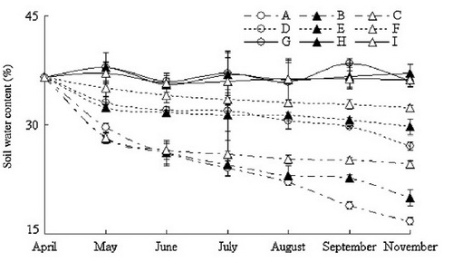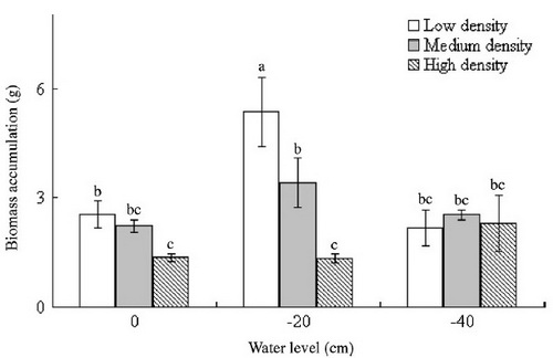 近日,以谢永宏研究员领衔的湿地生态研究团队以洞庭湖典型湿地植物辣寥为研究对象,研究了不同地下水位和密度条件下辣寥生态生理特征的差异性。结果表明:土壤水分含水量随水位下降而下降,但高密度条件下下降较少(图1)。在0cm和-20cm水位条件下,辣寥生物量随密度增加而逐渐下降,但在-40cm水位下,密度对辣寥生长无明显抑制作用(图2)。进一步研究发现,-40cm水位时,高密度有助于降低植物叶片的受损程度,具体表现为叶片质膜透性和丙二醛含量随密度增加而逐渐降低。可见,增加植物密度可通过维持土壤含水量而有助于植物抵抗干旱胁迫。该结果有助于正确认识密度对种群动态的调控作用,同时可为湿地植被恢复提供一定理论依据。