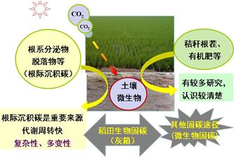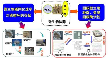 基于此,近几年来,中科院亚热带农业生态研究所农业生态过程方向研究团队、长沙农业环境观测研究站,在国家自然科学基金、中国科学院战略性先导科技专项、中国科学院、国家外国专家局创新团队国际合作伙伴计划等的资助下,整合14C同位素标记技术和微生物分子生态学技术(克隆文库、T-RFLP及定量PCR),结合室内培养实验与稻田长期定位试验,聚焦于典型稻田生态系统的生物固碳过程与机制,从水稻光合碳的输入、转化(图2)及其土壤微生物固碳功能及其生物学机制(图3)两方面开展工作,取得了一系列重要进展。