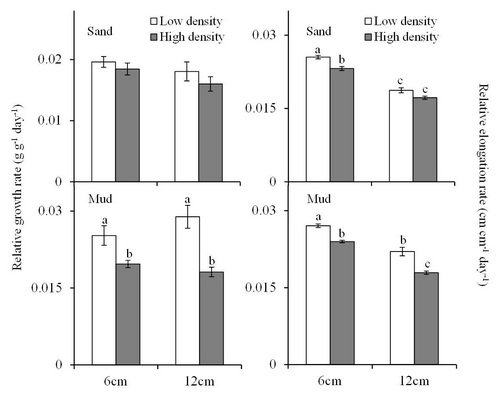 近日,洞庭湖湿地生态研究团队以典型沉水植物穗花狐尾藻为研究对象,在不同密度和基质条件下研究了不同片段长度穗花狐尾藻生长及繁殖潜力的差异性。结果表明:穗花狐尾藻在高营养及低密度条件下的相对生长速率要明显高于低营养及高密度环境(图1),但其相对生长速率不受片段长度大小的影响。相对伸长速率、基径及分枝数均随片段长度、基质养分含量的增加而增加,且低密度条件下明显优于高密度条件。对地上地下各器官养分含量分析表明,高养分条件及低密度条件下植物地上地下总N含量明显高于低养分和高密度条件。而植物地上总P含量仅与密度有关。高密度条件下植物地上部分总P含量明显降低。本研究表明较大的片段、高养分基质及低密度条件将明显有利于植物的定居,进而促进该植物种群的扩张。该结果有助于正确认识密度、基质及片段长度对沉水植物种群扩张的调控作用,同时可为湿地植被恢复提供一定理论依据。