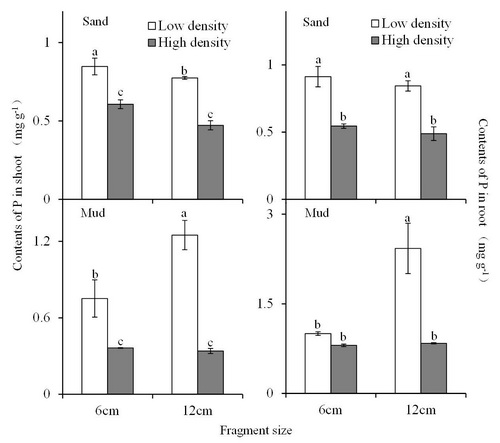 图2不同密度、基质类型条件下穗花狐尾藻不同长度片段地上、地下器官磷含量