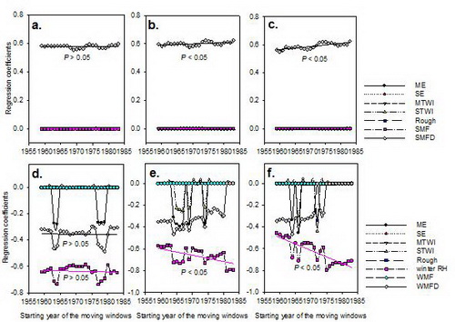 图2 标准化逐步回归系数变化特征,Rx510 (a), Rx530 (b), Rx5100 (c), CDD10 (d), CDD30 (e)和CDD100 (f),其中Rx510、Rx530、Rx5100分别为10年、30年和100年一遇的最大五天降雨量,CDD10、CDD30、CDD100分别为10年、30年和100年一遇的年最大连续不降雨天数。