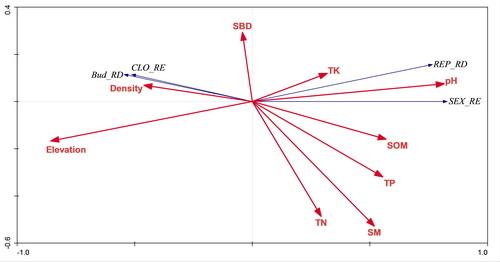 图1. 冗余分析(RDA)显示洞庭湖湿地短尖苔草繁殖分配和环境变量之间的关系