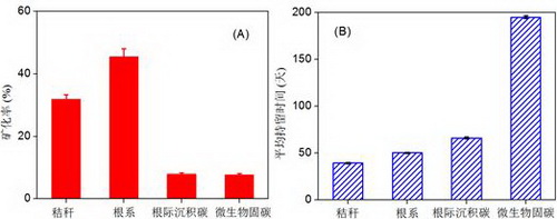图1 水稻秸秆、根系、根际沉积碳以及微生物同化碳在300天培养试验后的累积矿化率(A)及其在水稻土中的平均持留时间(B)