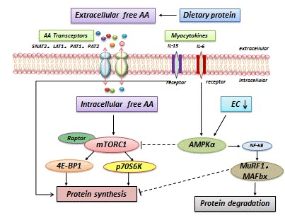 低蛋白日粮调节肌肉组织蛋白质代谢的潜在信号通路图