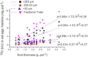 图1 水稻根系生物量与根际沉积碳在土壤粒径组分里的相关性