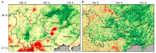 研究表明长时间序列卫星遥感数据监测能够揭示生态系统属性的连续变化,但其较粗的空间分辨率可能无法有效反映植被种类和功能变化,以至于可能会掩盖不合理治理措施的影响,亟需结合较高分辨率的遥感数据及地面观测来开展西南喀斯特地区区域尺度生态工程成效系统评估,揭示生态工程成效,并识别人类活动(不合理干扰、保护与建设)和气候变化对不同尺度生态环境变化的影响。