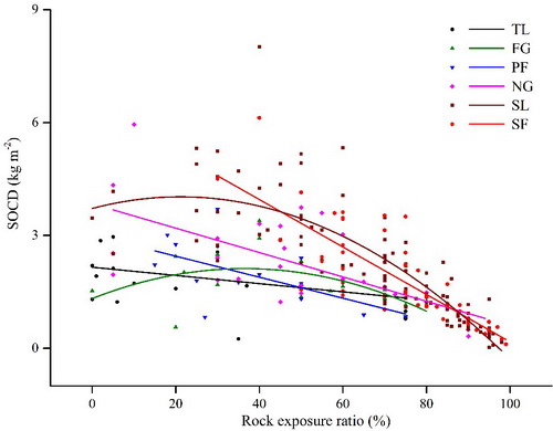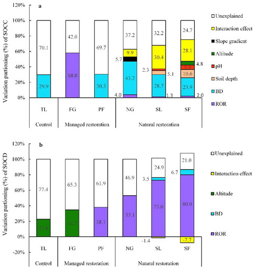 研究结果发现,自然恢复模式土壤有机碳含量显著高于人工恢复模式和耕地,而短期内(9年)人工恢复模式和耕地之间有机碳含量无显著差异。不考虑基岩出露对土壤有机碳储量影响,各植被类型之间有机碳储量无显著差异,剔除基岩出露影响后,自然恢复植被下有机碳储量显著高于人工恢复植被和耕地。方差分解表明,人工恢复方式下土壤有机碳含量和储量仅部分变异受环境因子(如基岩出露率、土壤容重、海拔)影响;而在自然恢复方式下,环境因子能有效解释有机碳含量和储量的大部分变异,且随着植被正向演替解释量逐渐增加,但有机碳含量和储量的环境驱动因子并不相同,前者受多个环境因子共同驱动(如土壤容重、基岩出露率、土层深度、pH等),后者则主要受基岩出露率驱动。基于对不同恢复模式下有机碳含量和储量变化分析及其环境驱动因子评估结果表明,相比人工恢复模式,短期内自然恢复更有利于土壤碳固持,且上述环境因子可作为评估自然恢复模式下土壤碳库变化的重要指标。