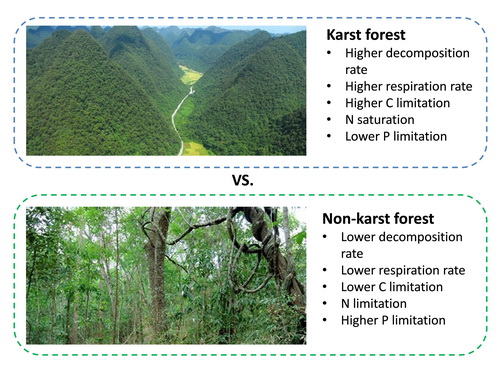 喀斯特森林与非喀斯特森林土壤微生物过程和养分限制比较示意图