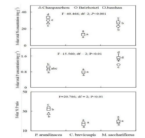 (2)不同演替阶段三种典型湿地植被(虉草、短尖薹草和荻)群落特征及土壤理化性质存在明显差异。植被总氮顺序为短尖薹草>虉草>荻,总磷为荻>虉草>短尖薹草。氮磷比以虉草群落最高,而其他两个物种无明显差异。相关分析表明,植被生态化学计量特征与土壤理化性质,尤其是土壤含水量及土壤总氮含量存在明显相关性;