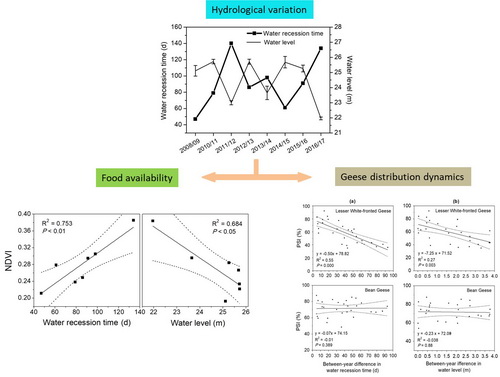 基于此,中国科学院亚热带农业生态研究所洞庭湖湿地生态研究团队以洞庭湖三种典型食草雁类(小白额雁、豆雁、白额雁)为研究对象,通过遥感、地理信息系统和野外调查,分析2008-2016越冬期三种食草雁类种群时空分布格局变化及其与生境变化的关系。研究发现,全球易危物种 (VU) 小白额雁的时空分布变化最明显,且与退水时间和越冬初期水位(10月平均水位)变化呈显著负相关;豆雁的时空分布则相对稳定,对生境变化可能更倾向于采用忍耐策略。与前二者不同,白额雁的数量和分布在研究期内发生了一次剧烈的转变,主要分布区由大小西湖(66.52%)转变为春风湖(58.99%)。物种的特征(体型、食性等)可对雁类之间的差异作出解释。此外,食物可获得性 (NDVI) 与水文条件的变化呈显著相关,因此,水文条件变化改变了洲滩植被生长状况,影响了以洲滩植被为主要栖息地和食物来源的食草雁类种群时空分布格局。因此,合适的退水时间和越冬初期水位对食草雁类(尤其是濒危物种小白额雁)来说至关重要。相关论文发表在Science of the Total Environment上。