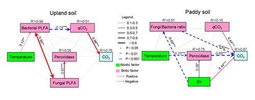基于此,中科院亚热带农业生态研究所博士研究生邱虎森在苏以荣研究员和葛体达研究员的指导下,采用同位素示踪技术定量研究了不同小分子外源碳(葡萄糖、乙酸和草酸)在亚热带红壤性水田和旱地土壤中的主要矿化和转化产物差异(CO2和MBC),研究发现,在培养期内,外源小分子有机碳在淹水稻田土壤中的累积矿化量比在旱地土壤中的累积矿化量低2-3倍。微生物对葡萄糖碳的固定量远大于对羧酸碳的固定量。相关性的结果发现厌氧环境限制了真菌分解有机碳的活性,导致稻田土壤较低的矿化速率和微弱的激发效应。我们结合结构方程模型构建了在稻田与旱地土壤中有机碳矿化速率与生物及非生物因子之间的关系,模型结果发现在旱地土壤中,细菌量的增加促进土壤有机碳矿化速率的增加。而淹水稻田土壤中真菌/细菌比值的增加抑制了土壤有机碳的矿化速率。而环境温度与土壤通气性通过改变微生物群落结构和限制其活性,导致稻田比旱地更利于有机碳积累。