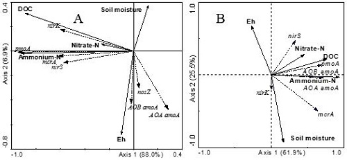 中国科学院亚热带农业生态研究所桃源农业生态试验站科研人员通过长期定位试验研究,揭示了稻田土壤氧化亚氮和甲烷的排放规律与土壤特征及功能微生物之间的耦合关系。利用定量PCR技术,科研人员从DNA和mRNA水平获得了不同处理下产甲烷菌(mcrA)、甲烷氧化菌(pmoA)、硝化菌(amoA)和反硝化菌(nirK/nirS/nosZ)数量。同时,测定了田间条件下甲烷和氧化亚氮的排放量以及相关的土壤理化性质。研究结果表明:甲烷和氧化亚氮排放呈负相关关系,氧化亚氮的排放量远低于甲烷的排放量。晒田和施用稻草通过改变土壤氧化还原电位、土壤铵态氮浓度和可溶性有机碳而影响相关功能基因的丰度。在DNA水平上,受土壤铵态氮和可溶性有机碳含量的影响,施用稻草显著提高amoA、nosZ和mcrA的丰度;在mRNA水平上,受土壤氧化还原电位的影响,持续淹水稻田mcrA基因丰度显著高于间歇灌溉稻田。甲烷的排放速率与mRNA水平上的mcrA基因丰度成正相关,与土壤氧化还原电位呈负相关;而氧化亚氮的排放速率与mRNA水平上的nirS基因丰度呈显著正相关,与土壤氧化还原电位正相关。本研究揭示了在mRNA水平上有活性的功能基因丰度,如mcrA基因与甲烷排放和nirS基因与氧化亚氮排放,可以反映酸性稻田受土壤氧化还原电位调控的甲烷和氧化亚氮此消彼长的关系。