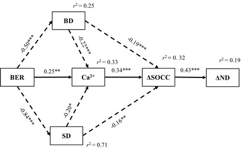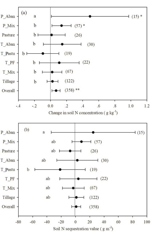 研究结果发现,植被恢复10年后小流域土壤N含量显著增加,其中牧草撂荒和牧草转为人工林混种模式显著提高了土壤N水平,但小流域和不同恢复模式土壤N储量均无显著变化。通过结构方程模型分析发现,裸岩出露通过影响养分元素(SOC、钙离子等)的再分布间接影响喀斯特生态系统土壤N固定。恢复10年后,土壤C:N比显著增加,土壤N固定显著滞后于土壤C固定,说明恢复初期土壤C、N积累存在脱耦现象。而土壤氮储量的变化与土壤C:N比变化显著相关,说明植被恢复初期土壤C和N之间的耦合受制于土壤N固定能力的不足。因此,喀斯特退化生态系统的快速恢复需要在植被恢复初期加强豆科植物引种和提高群落多样性等生态恢复措施,提升生态系统N素有效性和固持能力。