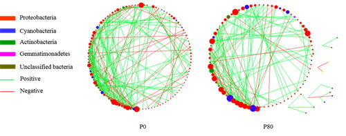 图2缺磷(P0)和施磷(P80)处理中,碱性磷酸酶编码基因(phoD)编码微生物的生态网络图